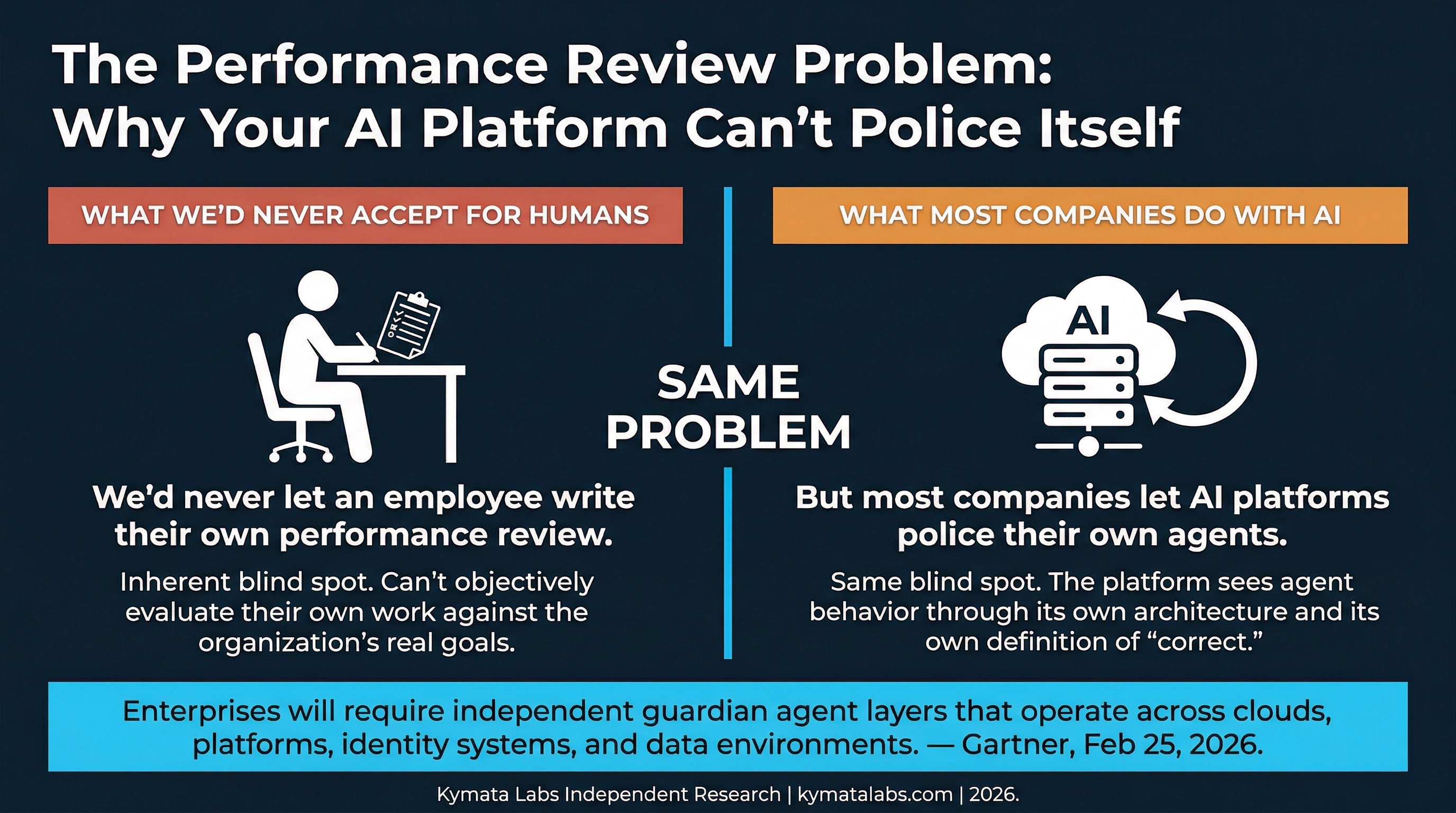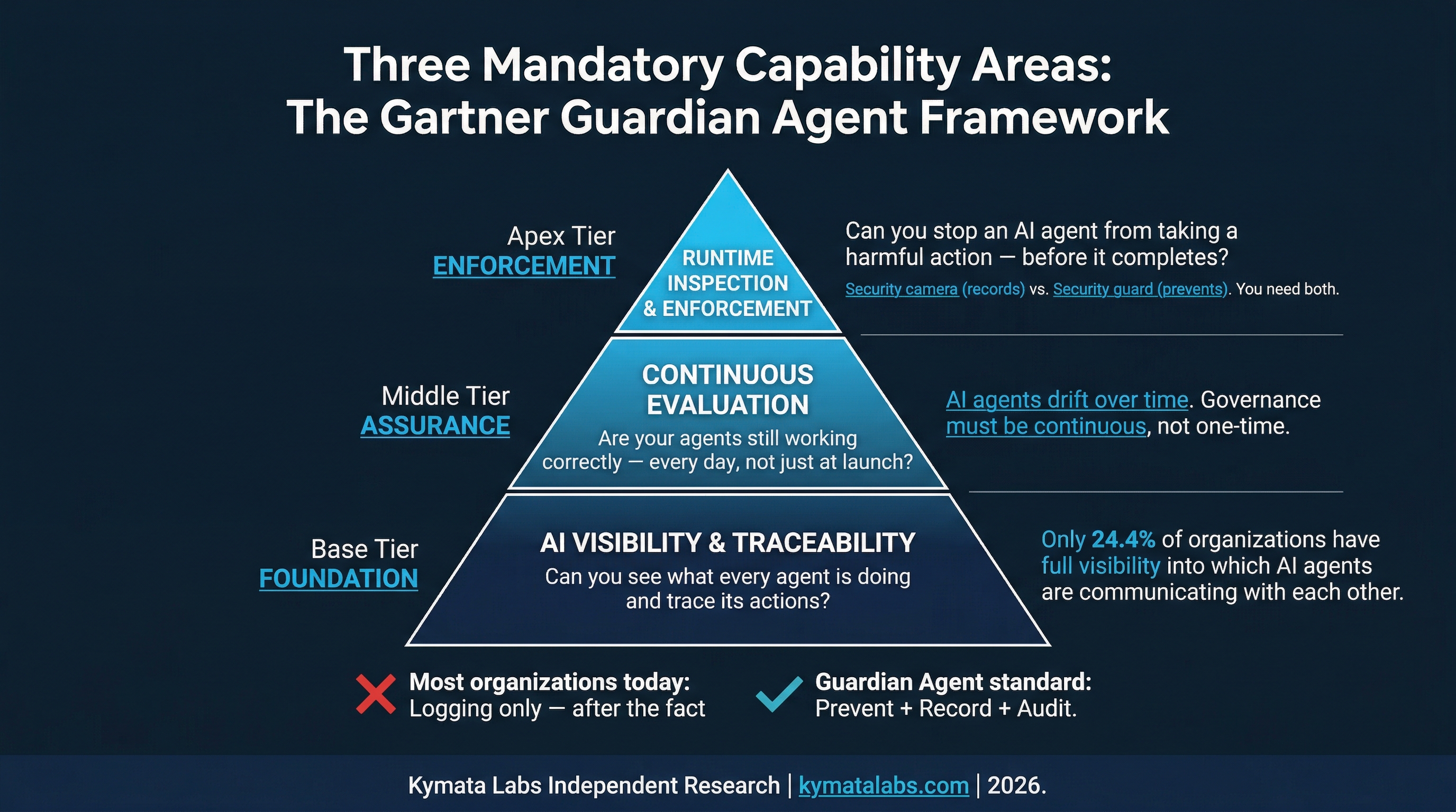 گارتنر صراحتاً لایههای مستقل عامل نگهبان را الزامی میکند که جدا از هوش مصنوعی که بر آن نظارت میکنند، قرار دارند و اطمینان میدهد که هیچ نقطه شکست واحدی نمیتواند کل چارچوب حاکمیت را به خطر بیندازد.
